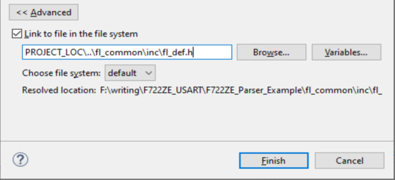 fl_common디레토리의 경로와 .h와 .c파일이름을 입력하고 'Finish'클릭해서 추가