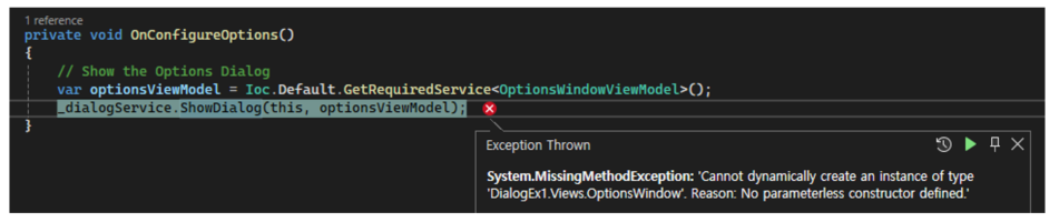 System.MissingMethodException: 'Cannot dynamically create an instance of type 'DialogEx1.Views.OptionsWindow'. Reason: No parameterless constructor defined.’