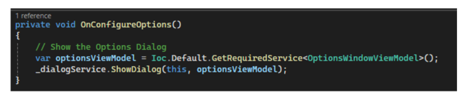 예) MainWindow에서 OptionsWindow를 모달다이얼로그로 표시(MainWindowViewModel.cs)