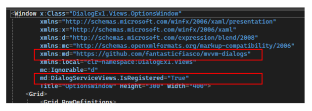 DialogServiceViews.IsRegistered="True" : ViewModel타입에 맞는 View를 찾을 수 있게 View를 등록하는 용도