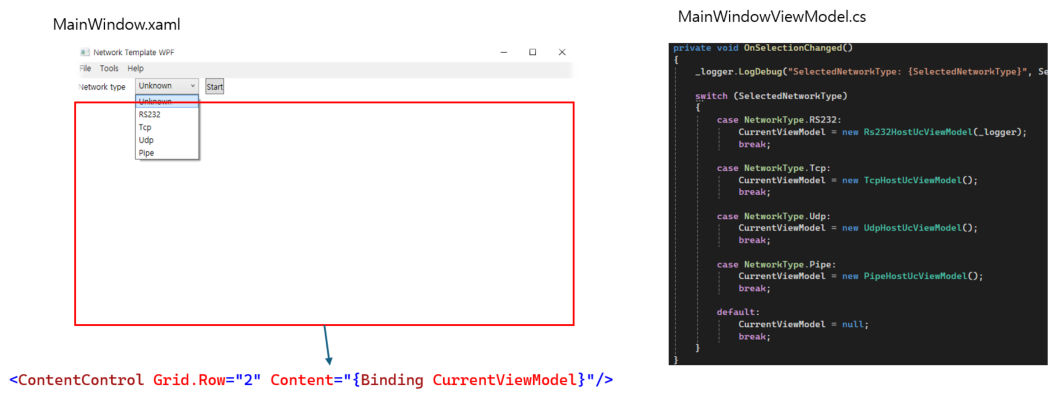 - Rs232HostUcViewModel타입의 데이터를 표시할 View(Rs232HostUc)에 연결하는 예