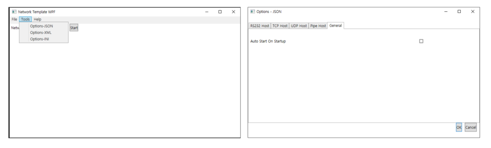 여러 형식으로 설정 파일을 읽고 쓰는 방법을 정리해 놓는다. 1. 프로젝트 만들기- Visual Studio 2022 Version 17.11.4- Target framework : .NET 8.0 2. 주요 nuget패키지Newtonsoft.JsonPeanutButter.INI 3. 실행화면 4. Json, Xml, Ini설정 읽기/쓰기- MainWindowViewModel.cs- 설정 읽기private void OnLoaded(object? obj){    // Load settings from a json file    _jsonSetting = JsonSettingHelper.LoadSettingNetworkTemplateWpfSetting>(JsonSettingFileName);    // Lo..